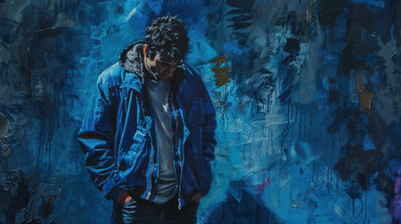 A man wearing a denim jacket and sunglasses leans against a vibrant blue wall embodying a relaxed and cool urban style in bright daylight.
