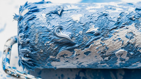 A close-up view of a paint roller heavily covered in thick, textured blue and white paint with a metal handle.