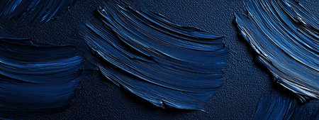 is a close-up, macro view of thick, textured strokes of deep blue oil paint applied to a canvas. The impasto technique creates a rich, tactile surface with visible brush marks and varying levels of gloss and shadow. The deep indigo and navy hues are intense, showcasing the materiality of the paint and the artist's expressive application. The texture is the primary focus, offering a dynamic and visually engaging abstract composition.