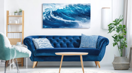 This inviting living room features a vibrant blue couch and stunning ocean wave artwork, creating a serene atmosphere with modern furnishings and greenery.