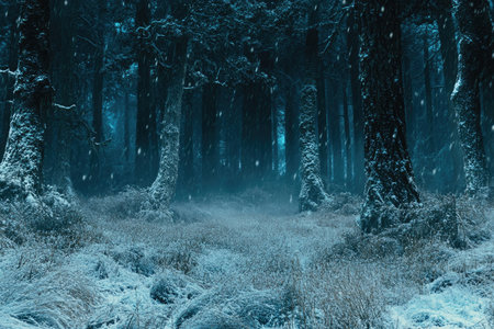 A cinematic photograph of an enchanted forest in winter, with tall trees covered in snow and some grass on the ground. The lighting is cinematic, with cold tones and desaturated colors. Heavy snowfall is visible, captured in the style of Roger Deakins. --ar 3:2 --v 6.1 Job ID: a3273a41-e77e-40f2-aa7b-cd0eb5961c6b