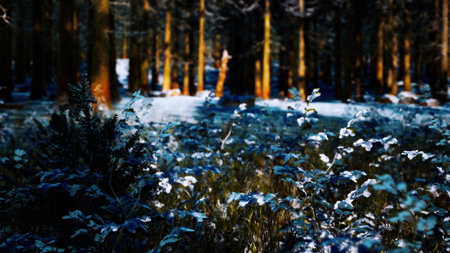 A enchanting forest bathed in moonlight reveals delicate frost on vibrant leaves. Tall trees cast mystical shadows, creating a serene atmosphere at twilight, inviting exploration.