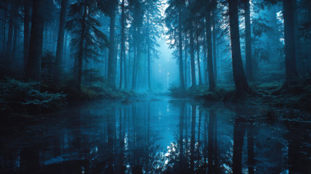 magical night forest covered in blue mist bewitching moonlight nobody around the concept of nature and halloween