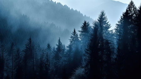 A foggy wood pine forest with dark trees shillouettes and purple blue colors. Dramatic fog in the forest illustration. Ai generated