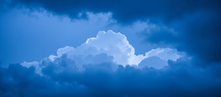 Fluffy white solar clouds in the twilight light float against the dark blue sky. Divine view. Concept and background dream, integrity, wholeness, unity, totality, Halloween.