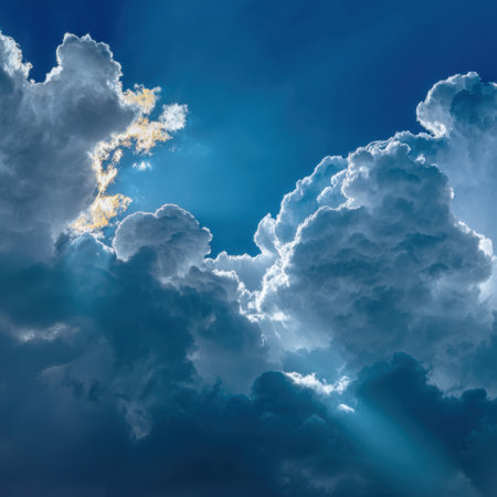 The image captures an expressive sky filled with clouds, where sunlight pierces through, creating a stunning array of light and texture, perfect for various projects.