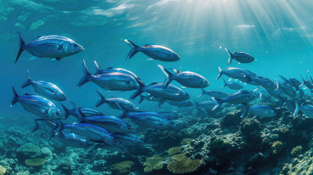 A captivating scene of a school of fish swimming in clear ocean waters, illuminated by soft natural light, creating a serene underwater atmosphere.