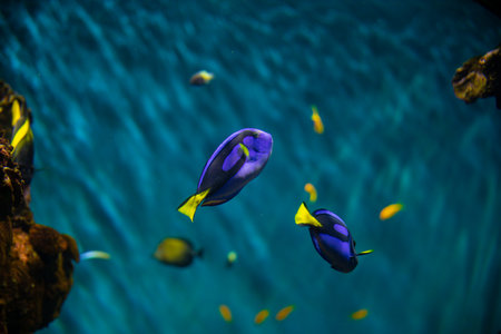A group of fish swim through the ocean water with details in a close up shot. The image shows a fish with yellow fins with the other in the background. Coral can be seen along the left side. The lighting is diffused, suggesting a submerged environment with a naturalistic aesthetic suitable for various applications.