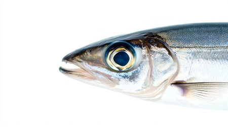 close up view showcases a herring revealing its sleek body and notable eye detail. The fish is prominently displayed against a stark white backdrop.