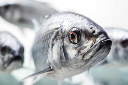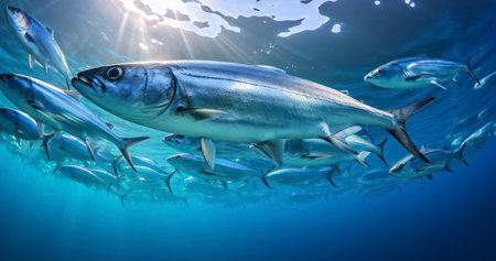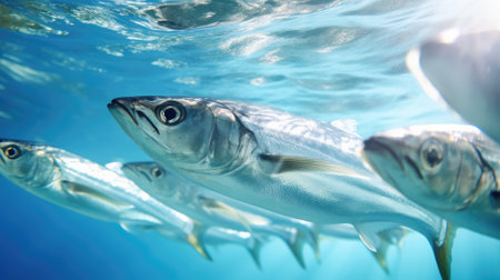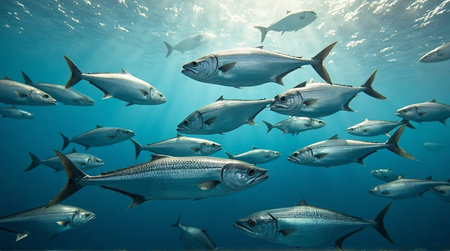 School of silver fish swimming gracefully in clear blue ocean water under sunlight