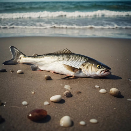 A fish rests on the sandy beach, surrounded by small stones and shells, while ocean waves quietly break in the background, highlighting the distressing issue of marine life decline.