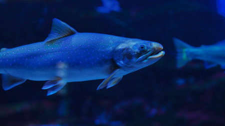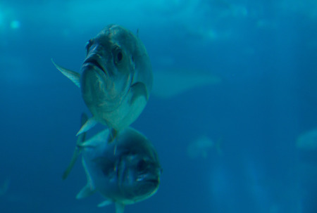 fish in aquarium oceanarium in blue depth water shoot from glass with noise.