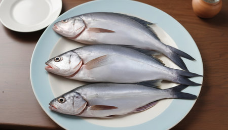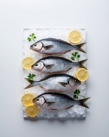 AI Generated. Three Fish on Ice with Lemon Slices and Parsley