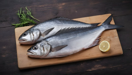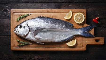 AI Generated. Fresh whole fish on wooden board with herbs and lemon