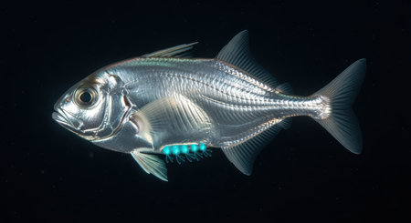 A single translucent fish glows with ethereal blue light while swimming through dark water displaying its visible internal skeleton and large reflective eye.
