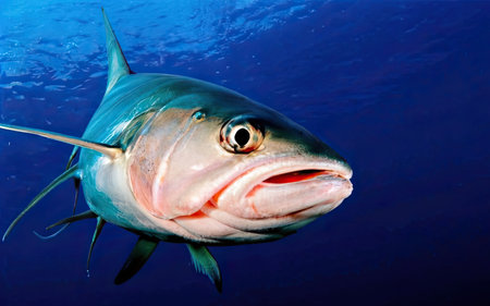 Majestic Underwater Shot of a Single Fish Swimming Gracefully in the Deep Blue Ocean Waters, Illuminated by Ambient Light AI Generative