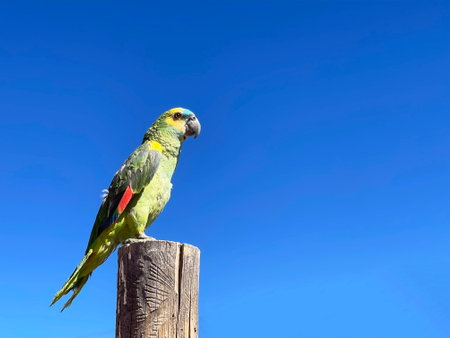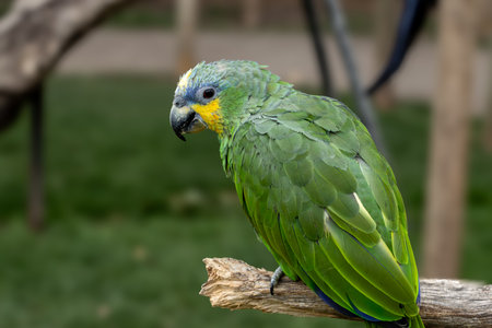 funny looking turquoise-fronted amazon (Amazona aestiva), also called the blue-fronted parrot, in the wild in a park of Buenos Aires City