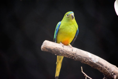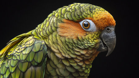 Parrot with green, yellow, orange and black feathers, portrait, profile close up view
