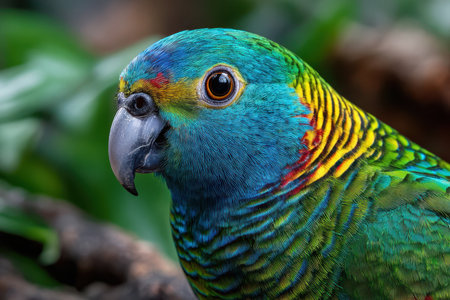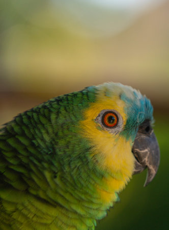 Macro shot of an Amazon parrot with green, yellow, and turquoise plumage. The bright red eye and fine feather detail highlight the elegance of this intelligent tropical bird.