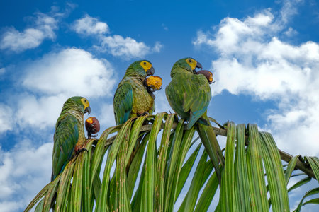green colored parrot bird with yellow head and red belly, palm lagoon Lagoa Das Araras, Bom Jardim, Nobres, Mato Grosso, Brazil, South America