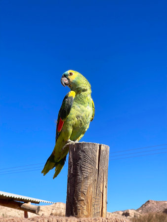 Big green parrot against blue sky, copy space