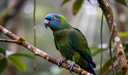 Colorful parrot sitting on a branch in the rainforest.