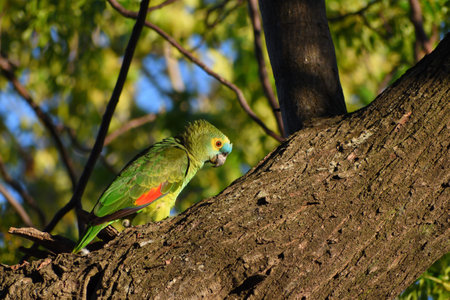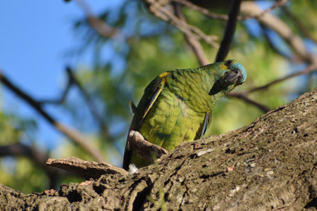 turquoise-fronted amazon (Amazona aestiva), also called the blue-fronted parrot, in the wild in a park of Buenos Aires City