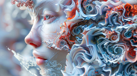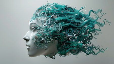 Abstract 3D Rendering of White. Female Face with Green, Swirling Mechanical Parts Forming Hair