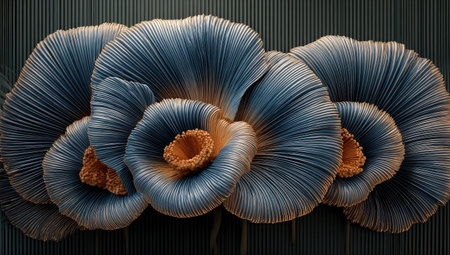 This image presents a close-up of stylized, abstract flowers. The petals display a textured quality, with varying shades of blue and orange. The composition suggests a studio setting, emphasizing the intricate details and vibrant color contrasts. Suitable for various design applications, the image offers a visually captivating aesthetic.
