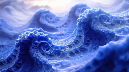Fractal landscape forming blue waves under a cloudy sky with a bright sun shining. Ai generated
