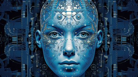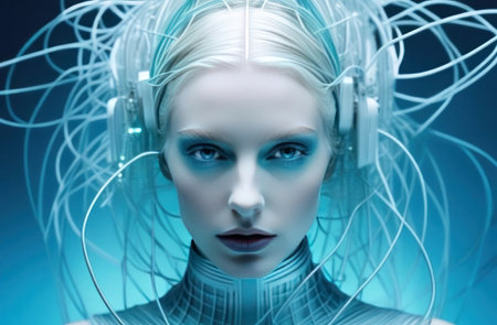 Stunning futuristic cyborg woman with a complex network of wires. A perfect blend of human and artificial intelligence.
