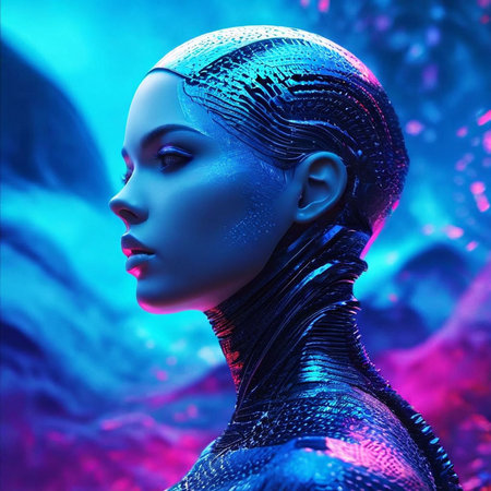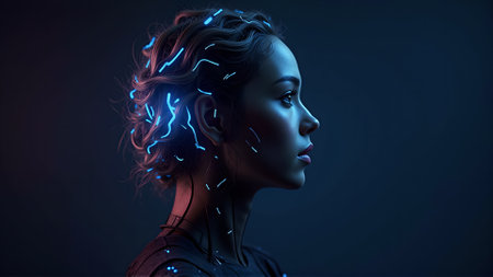 A cyberpunk-style portrait of a woman with neon lights integrated into her hair and skin, symbolizing AI and futuristic technology