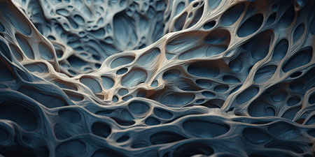 A complex D surface with crisscrossing lines and geometric patterns, featuring an intricate design with depth and texture in dark hues of blue and purple