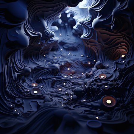 An artistic rendering of flowing blue shapes against a dark background, creating a sense of movement and depth.