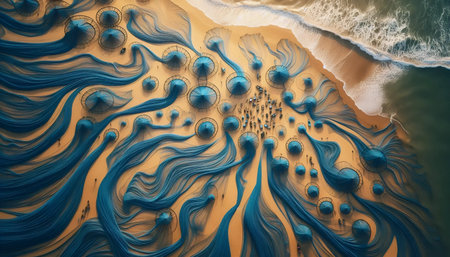 Sandy patterns under tranquil azure waters provide a peaceful oceanic scene. Below, the seabed's intricate layers tell stories of sediment and tide, reflecting the light from above..