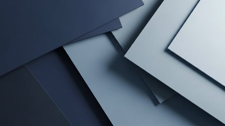 Overlapping geometric planes in various shades of blue and grey create a minimalist and sophisticated abstract background.
