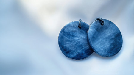 A pair of elegant blue circular earrings rests gracefully on a soft white fabric background, showcasing chic jewelry design ideal for fashion photography.