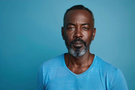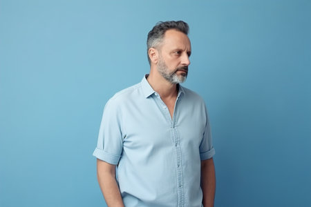 A man with a beard and gray hair is wearing a blue shirt. He is looking at the camera with a serious expression