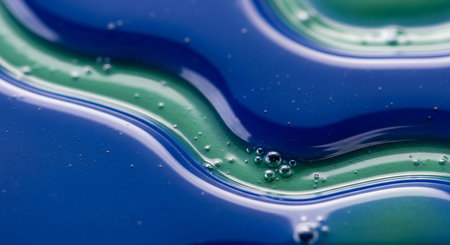 Macro view of swirling blue and green liquid with small bubbles and glossy highlights.