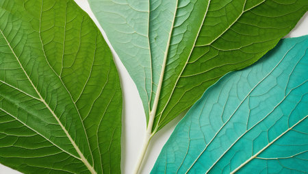 Vibrant green and turquoise leaves arranged on a white background, showing intricate vein patterns. Ai generated image