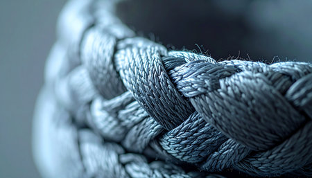 A detailed macro photograph captures the complex and orderly weave of a heavy-duty synthetic rope. The interlocking fibers create a powerful visual metaphor for strength, unity, and the reliability that comes from many individual strands working together as one.