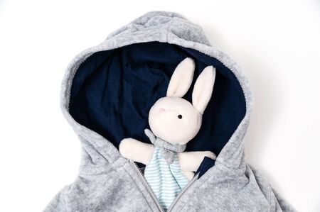 The plum bunny are dressed in a sports baby jacket with a hood.