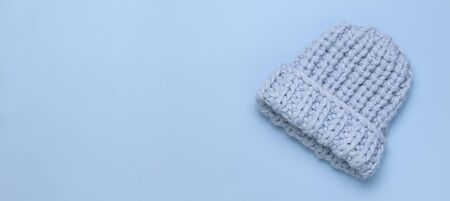 Flat lay fashionable blue knitted winter hat for women on blue background top view. Stylish woolen hat, concept of winter accessories for the cold. Advertising, shopping, winter sale.