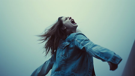 Portrait of a beautiful smiling woman in denim jacket on blue background