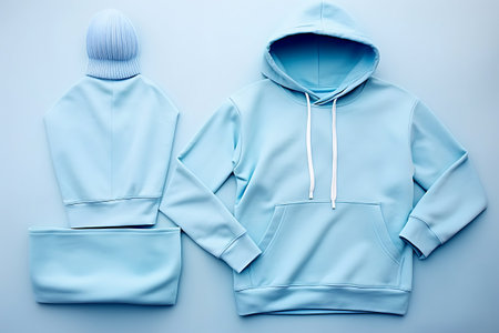 Blue hoodie, T-shirt and accessories on a blue background. Clothes for the cold season. Top view, flat lay. Athleisure style. horizontal photo