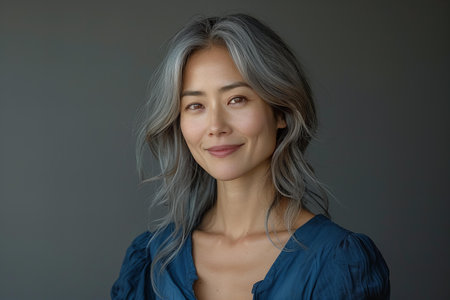 Smiling asian woman with blue top and grey hair, high quality, high resolution