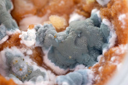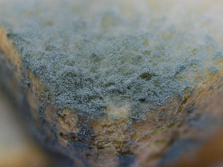 Macro of moldy fungus on food. Fluffy spores mold as background. Moldy, spoiled food.