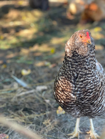 Close up view of healthy chicken from organic breeding on free range farm. The hen stares at the camera curiously.