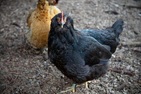 Chicken close-up. Black chicken on the farm. Livestock farm. Poultry farm. Laying hen.