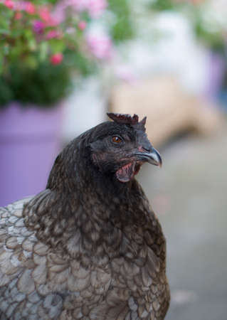 portrait of a gray hen with a small scallop close up, the hen looks straight into the eyes